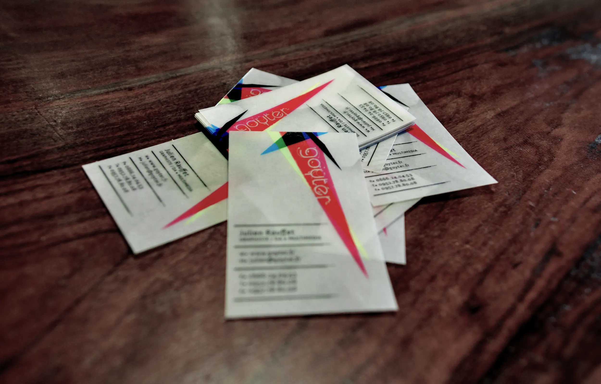 Pour maintenir cette atmosphère vaporeuse, les cartes de visite sont imprimées sur du papier calque 200g, offrant une transparence nuageuse ;).