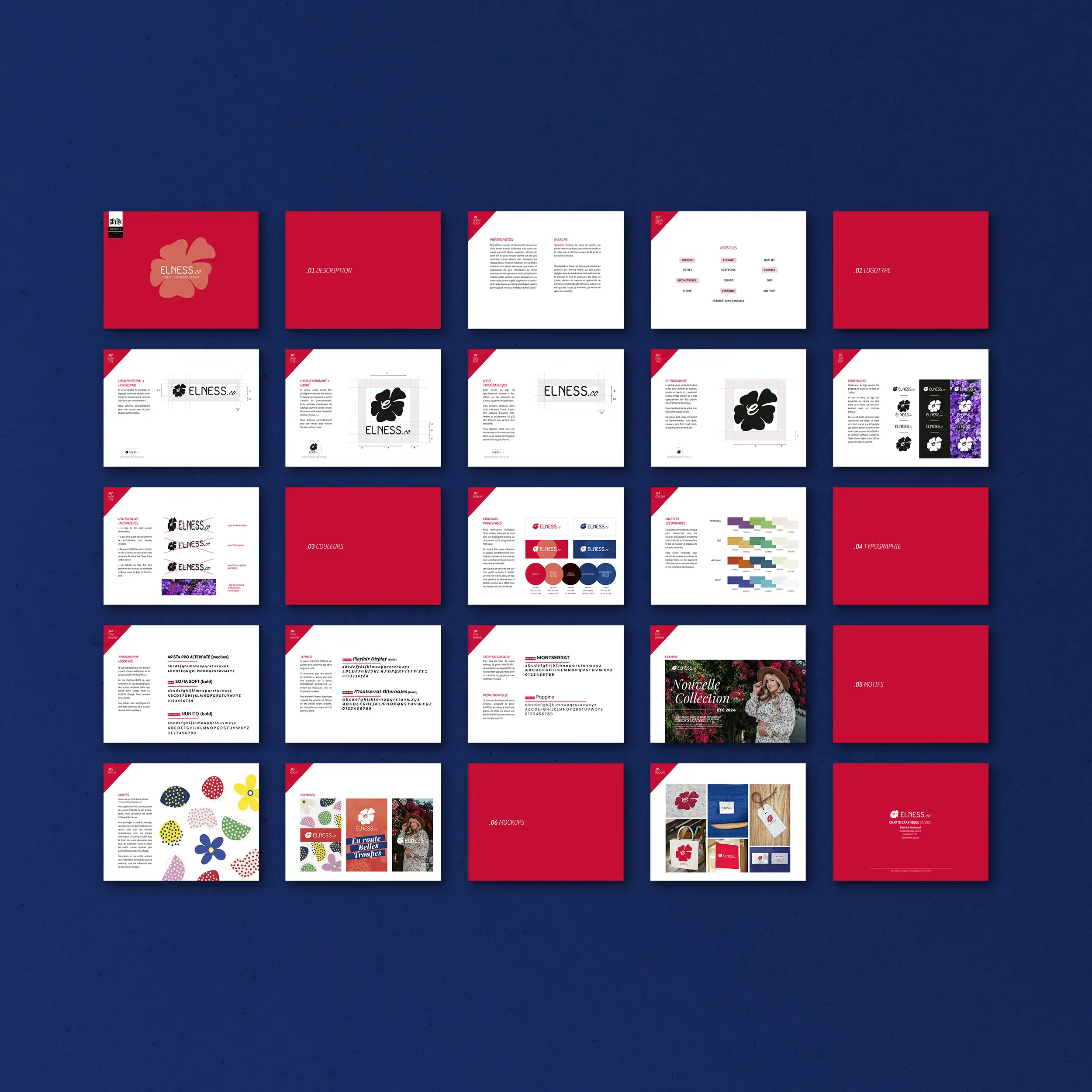 Les motifs choisis pour habiller les futures communications de la marque sont issus des premières impressions réalisées par Elness en collaboration avec Eddie Baehr Design.