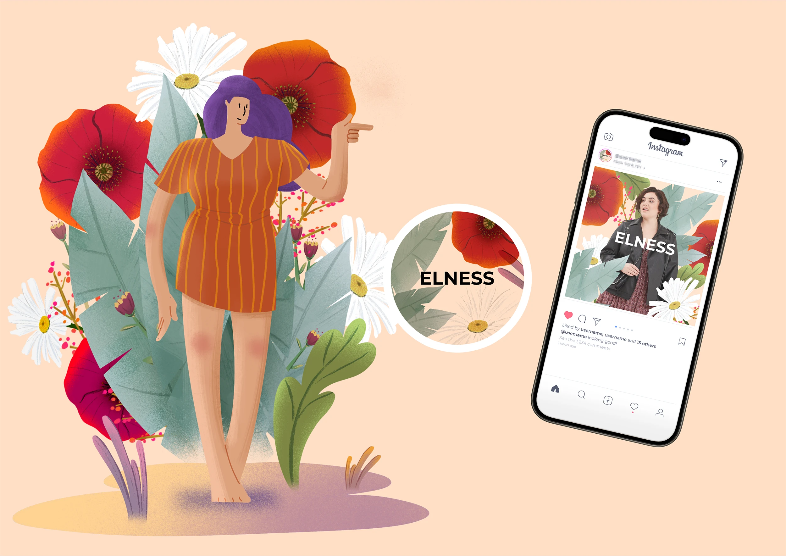 Elness est un fabricant français de prêt-à-porter pour femmes rondes, déterminé à inspirer joie et confiance chez ses clientes grâce à ses motifs fleuris, ses couleurs vibrantes, ses tissus de qualité, ainsi que la rigueur de sa fabrication. Nous avons développé une identité visuelle intégrant ces valeurs et objectifs dans un logo à la fois dynamique et sérieux, adaptable à divers contextes d'utilisation.