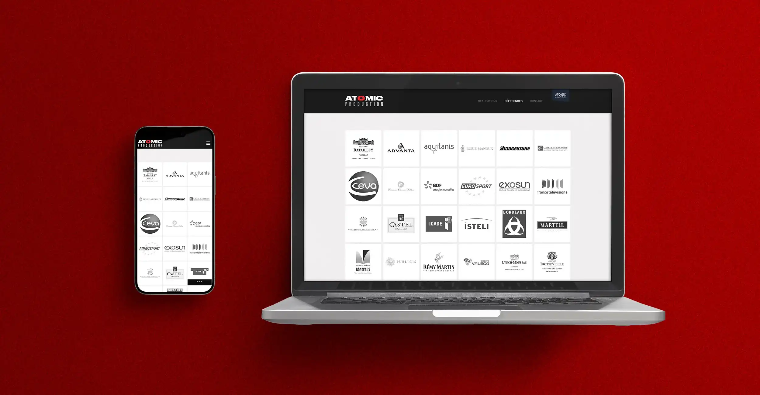 Création webdesign et intégration/développement du site de la société de production vidéo Atomic Production.