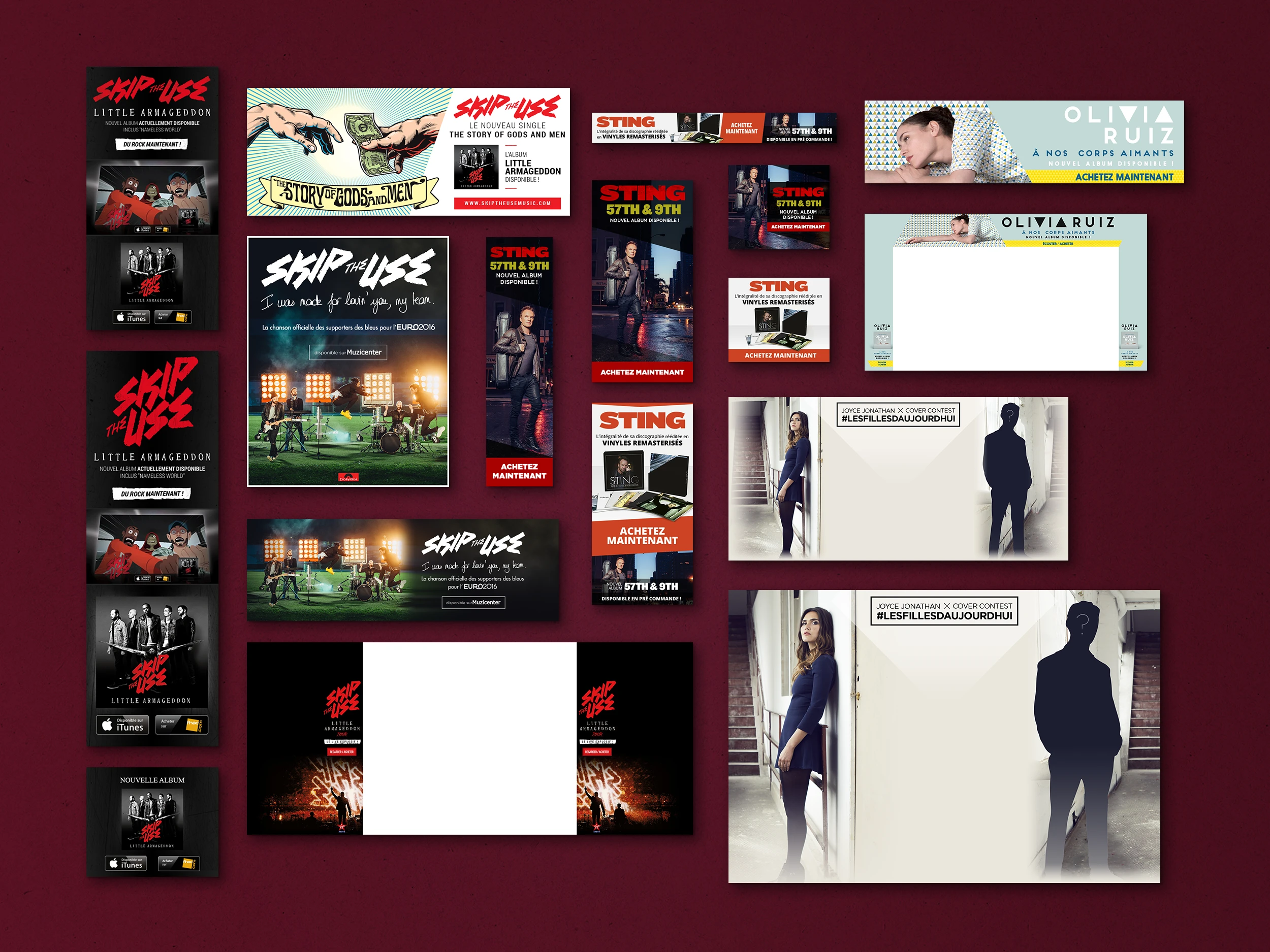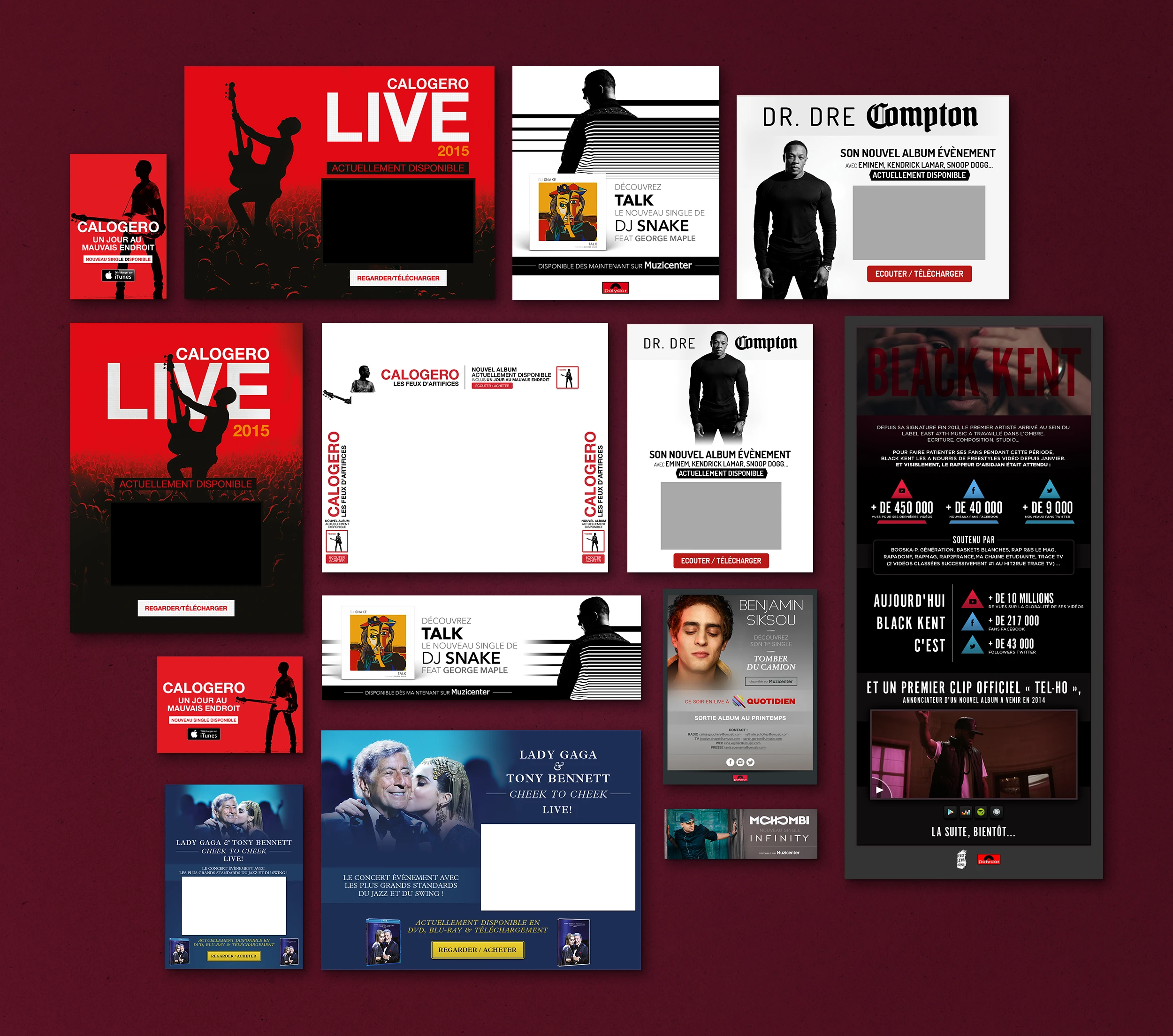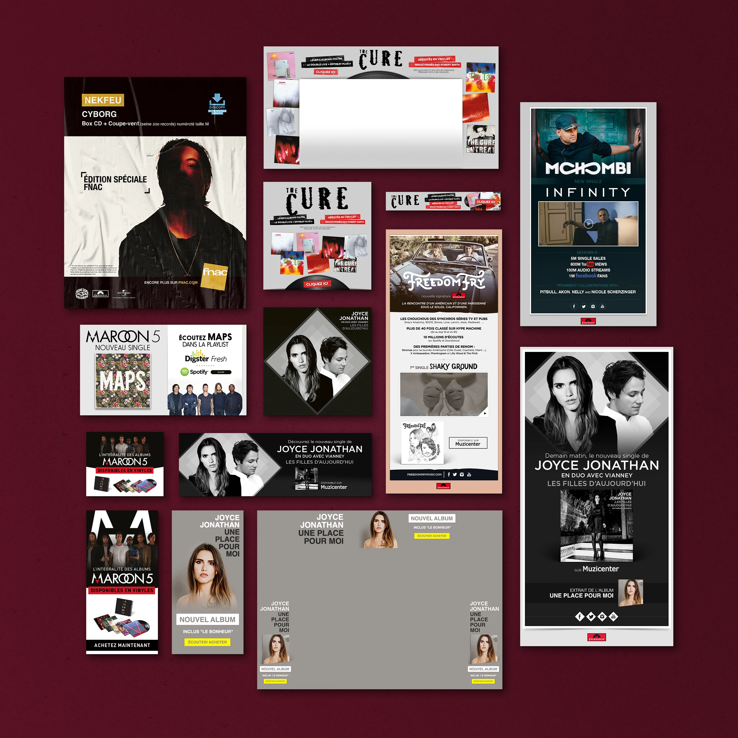 Éléments print : Affichage, pubs presse, flyers, ... Éléments web : Ecards, newsletters, newsletters responsive, mini-site, modules web, vidéos, pubs web, habillages, ...