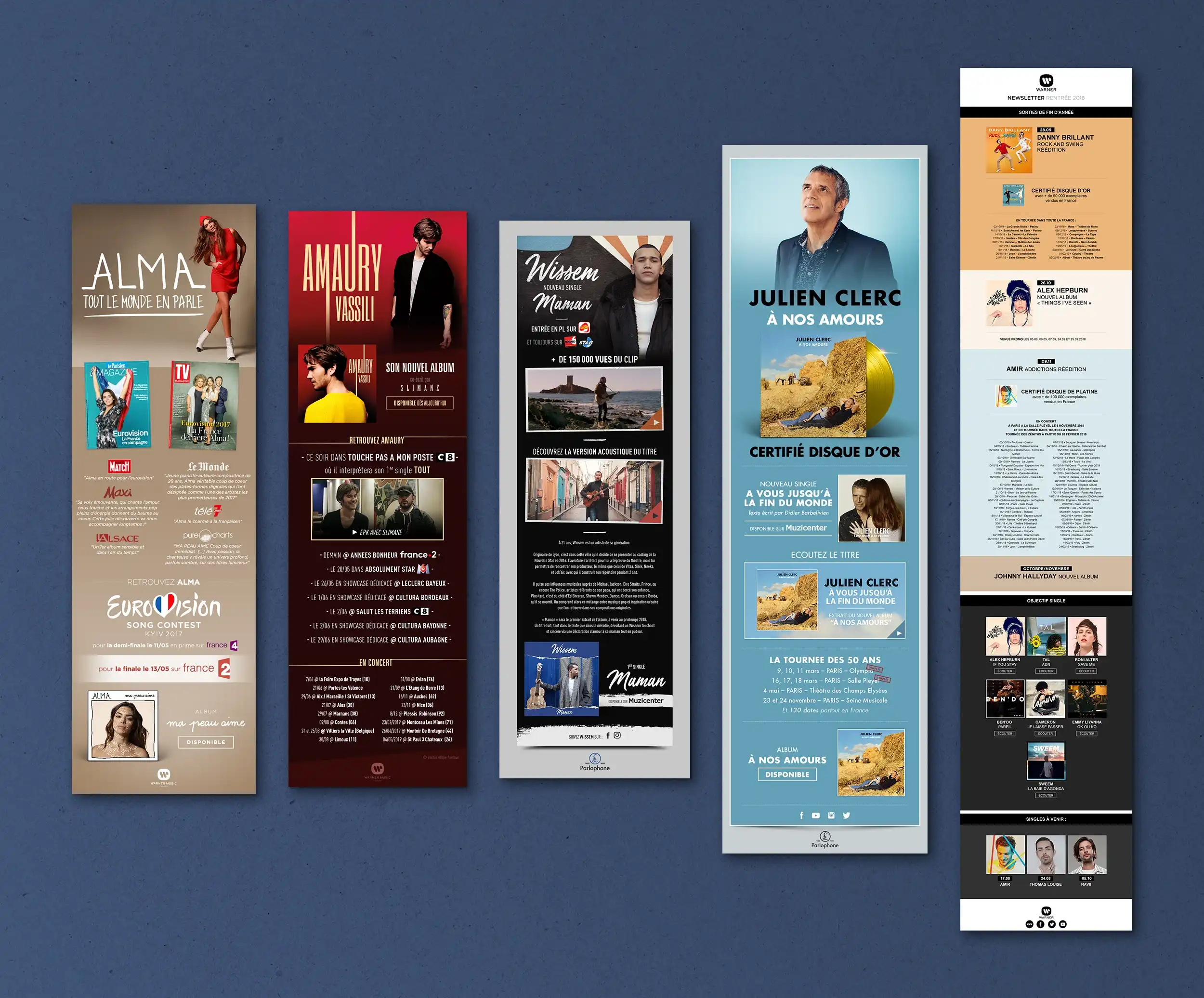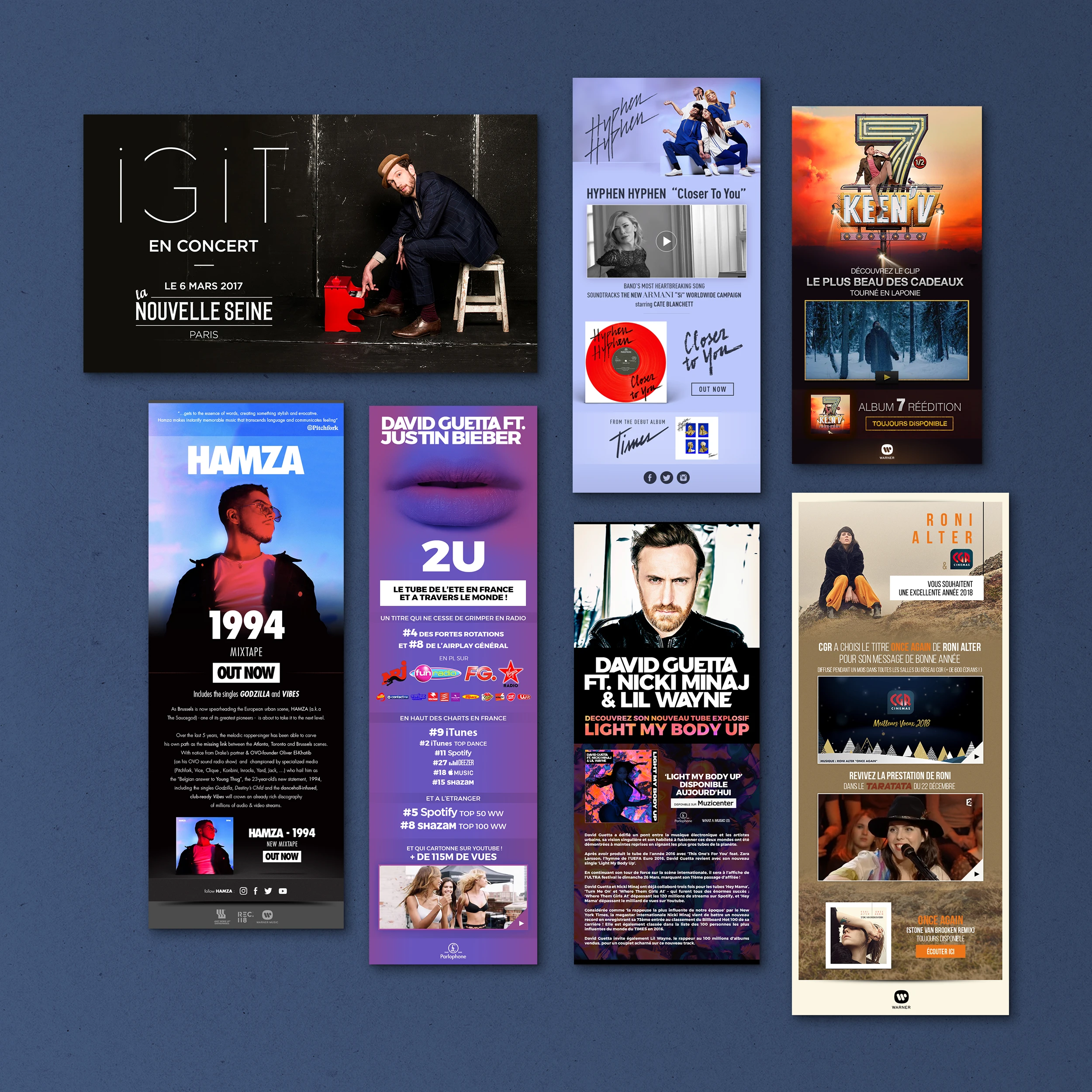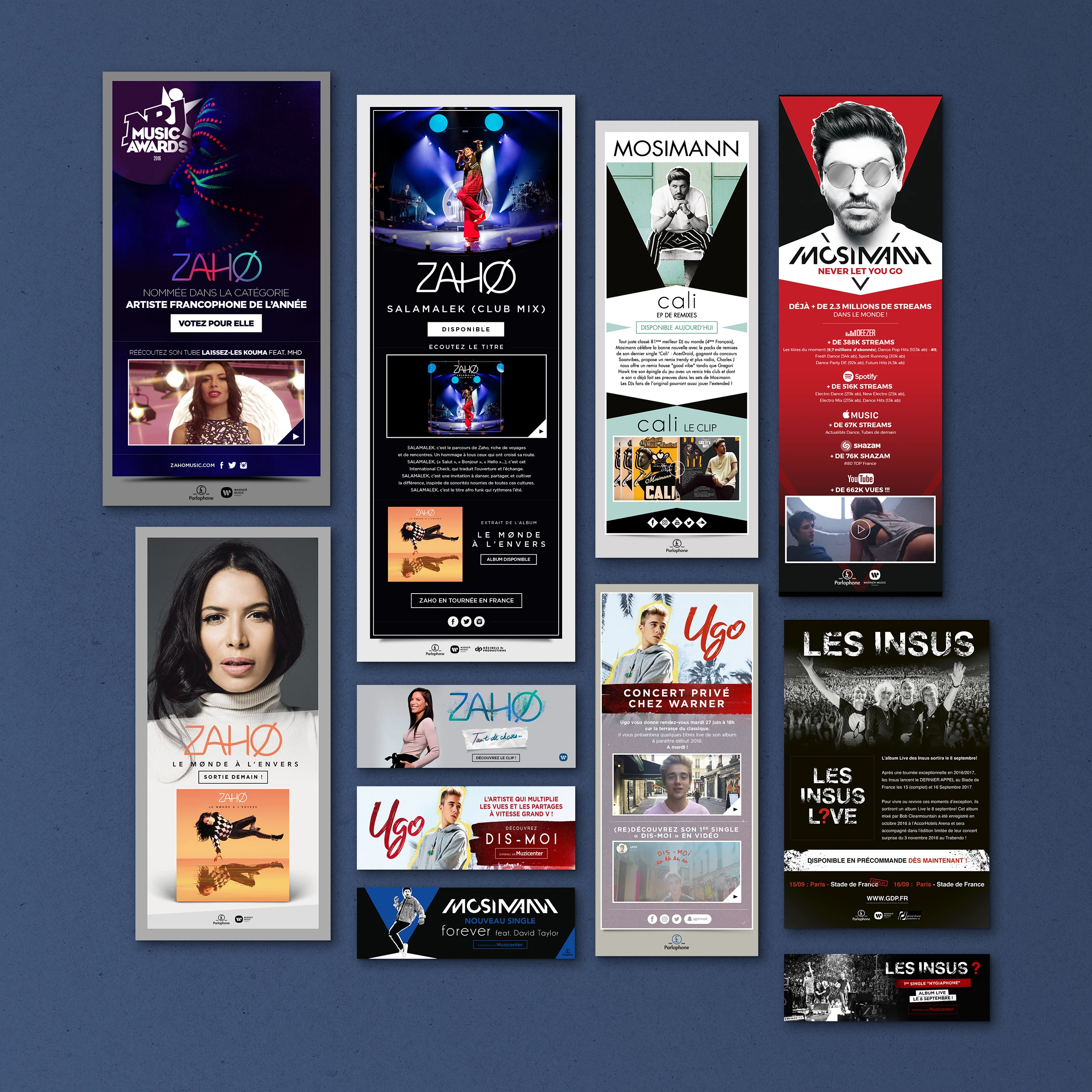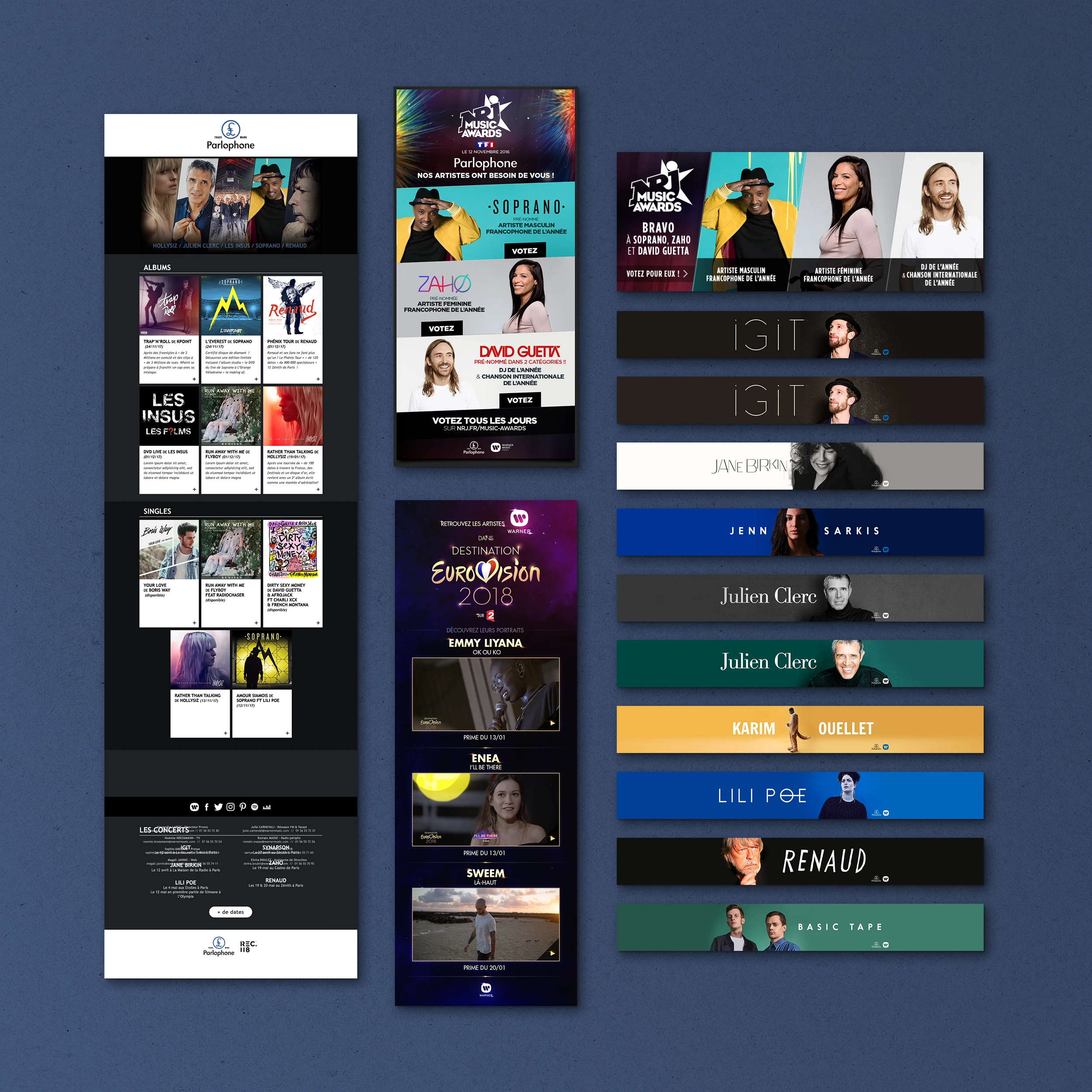 Éléments print : Affichage, pubs presse, flyers, ... Éléments web : Ecards, newsletters, newsletters responsive, mini-site, modules web, vidéos, pubs web, habillages, ...