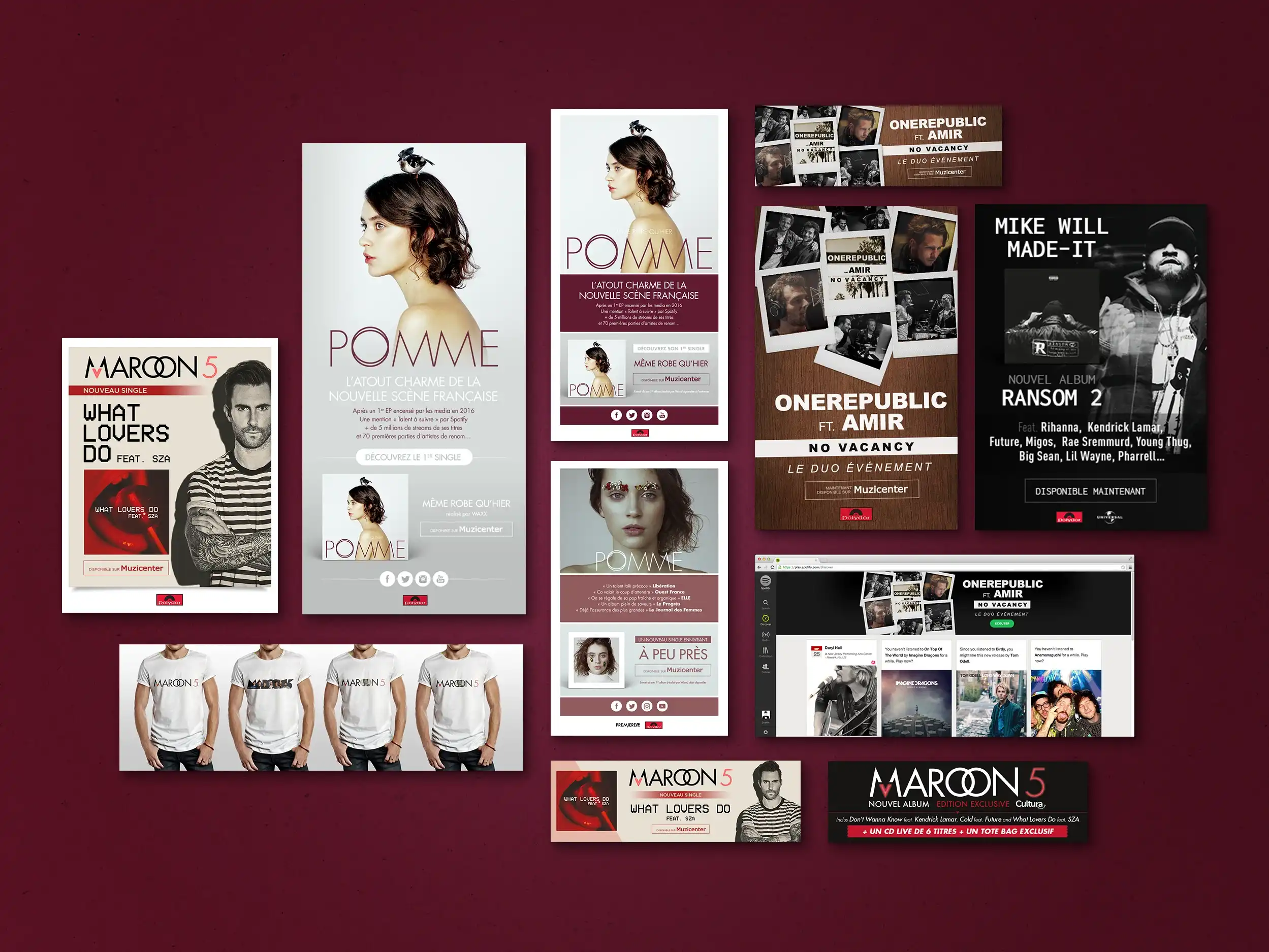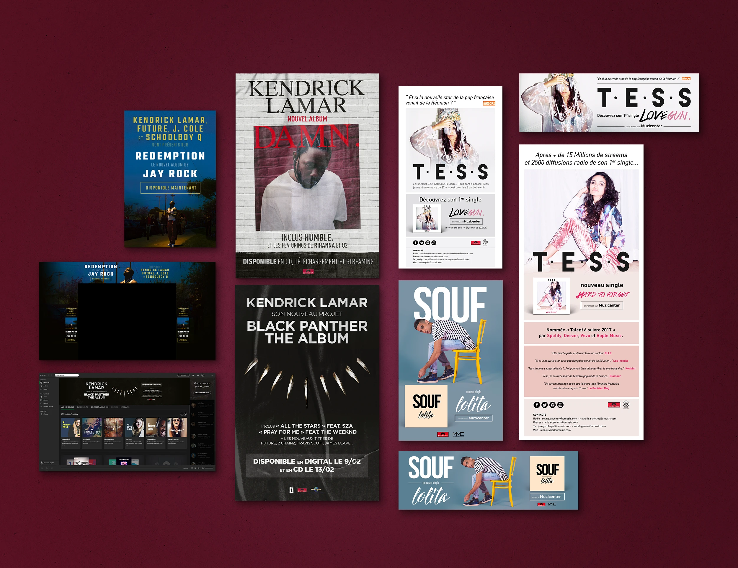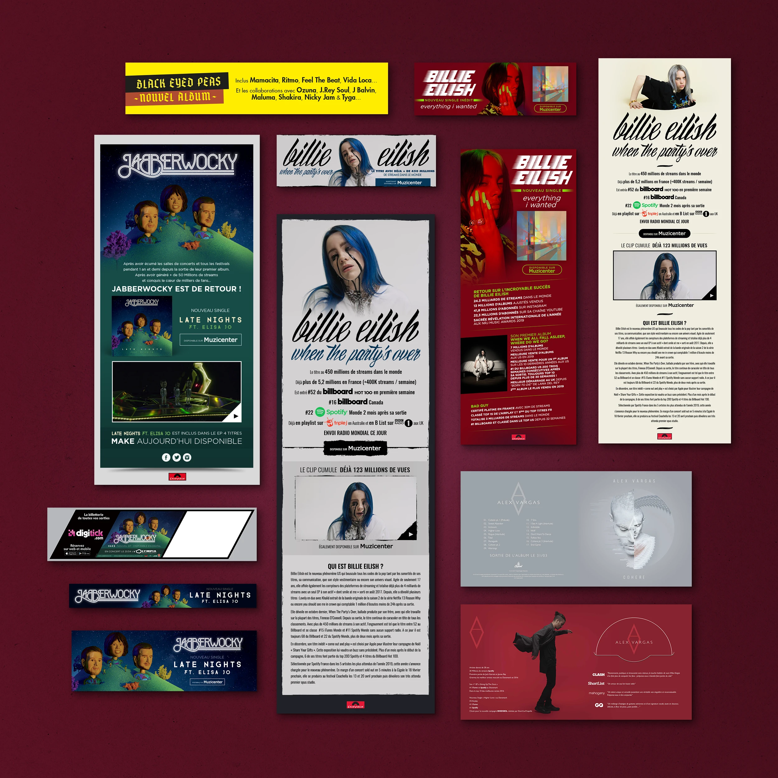 Éléments print : Affichage, pubs presse, flyers, ... Éléments web : Ecards, newsletters, newsletters responsive, mini-site, modules web, vidéos, pubs web, habillages, ...